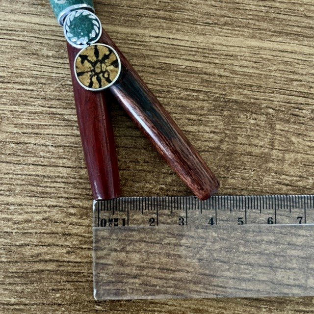 Materiál: Vyrobené z pevného amazonského dreva v kombinácii so surovým kúskom liany ayahuasca, ktorá v šamanskej tradícii predstavuje "dušu" ceremoniálnej praxe.