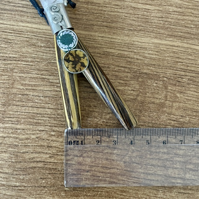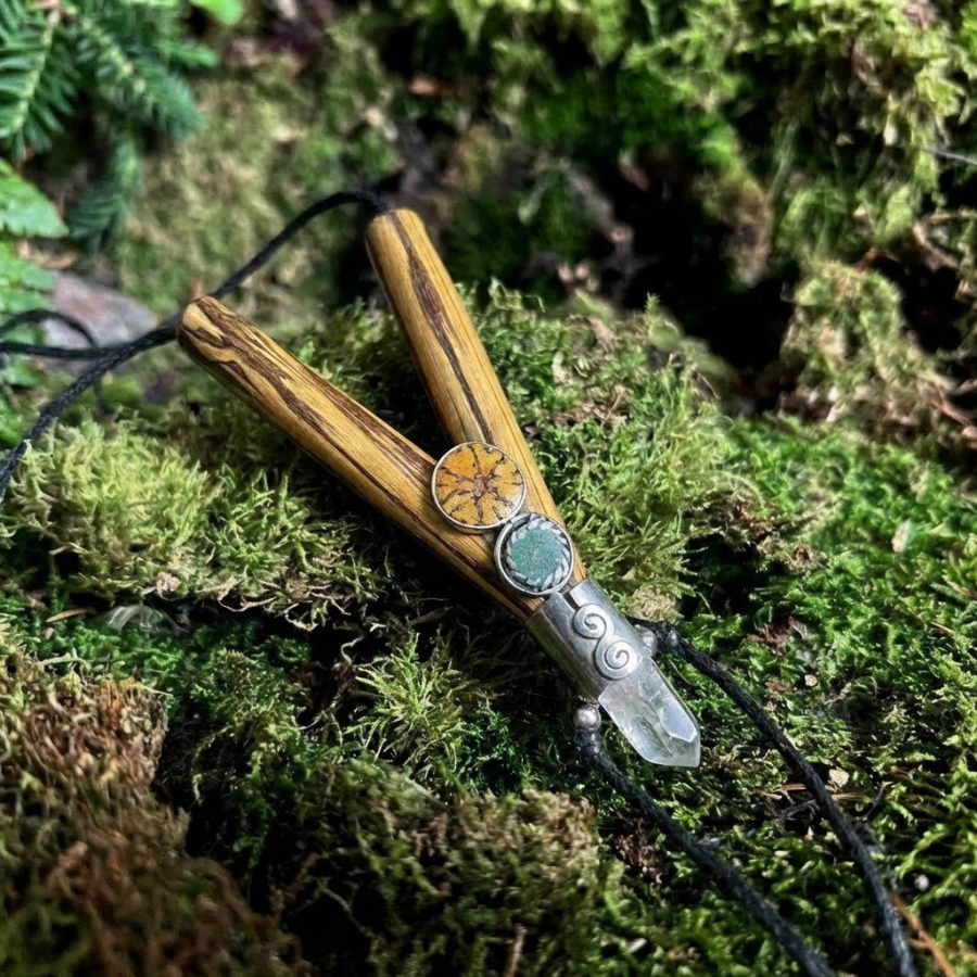 Dekorácia: Zakončené prirodzeným krištáľovým hrotom (horský krištál/kremeň), ktorý je v minerálnej ríši považovaný za univerzálneho liečiteľa a zosilňovač energie - funguje ako "pamäť" a čistič priestoru.